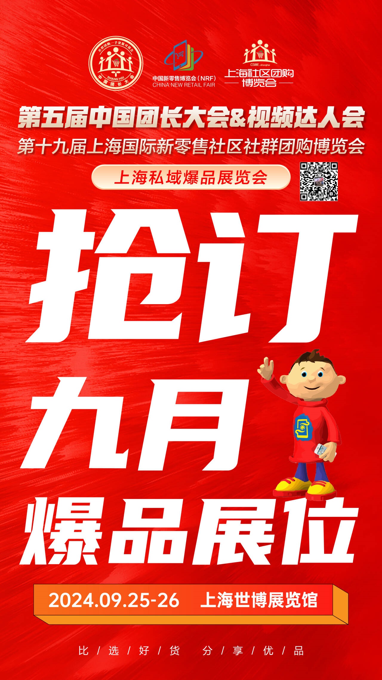 第五届中国私域团长大会&视频达人大会 第十九届上海国际新零售社区社群团购博览会 上海私域爆品展览会 时间:2024年9月25-26日 地点:上海世博展览馆(博成路850号)