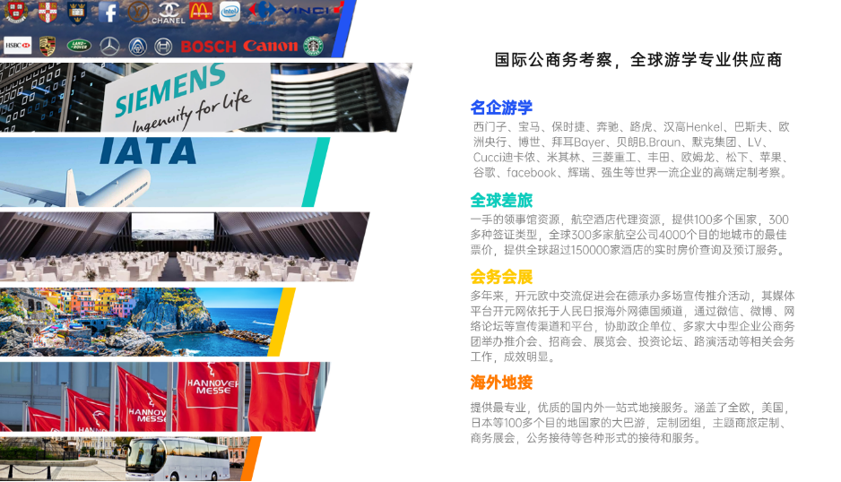 开扬文化咨询服务有限公司专注服务于各级政府部门,企事业单位,商会、协会,商学院、行业媒体、教育培训机构等;全球定制培训,衔接境外考察单位对标学习,代发商务邀请函,协助办理签证等全套地接服务,贯穿从提出考察需求到考察结束回国、再到后期项目洽谈的所有环节,致力于打造全球高端学习交流与资源整合平台。为客户提供定制化,有深度、具有影响力的全球化学习资源与服务,也是一家集航空代理、旅游、酒店、差旅管理、会展、物流等为一体的多元化企业。