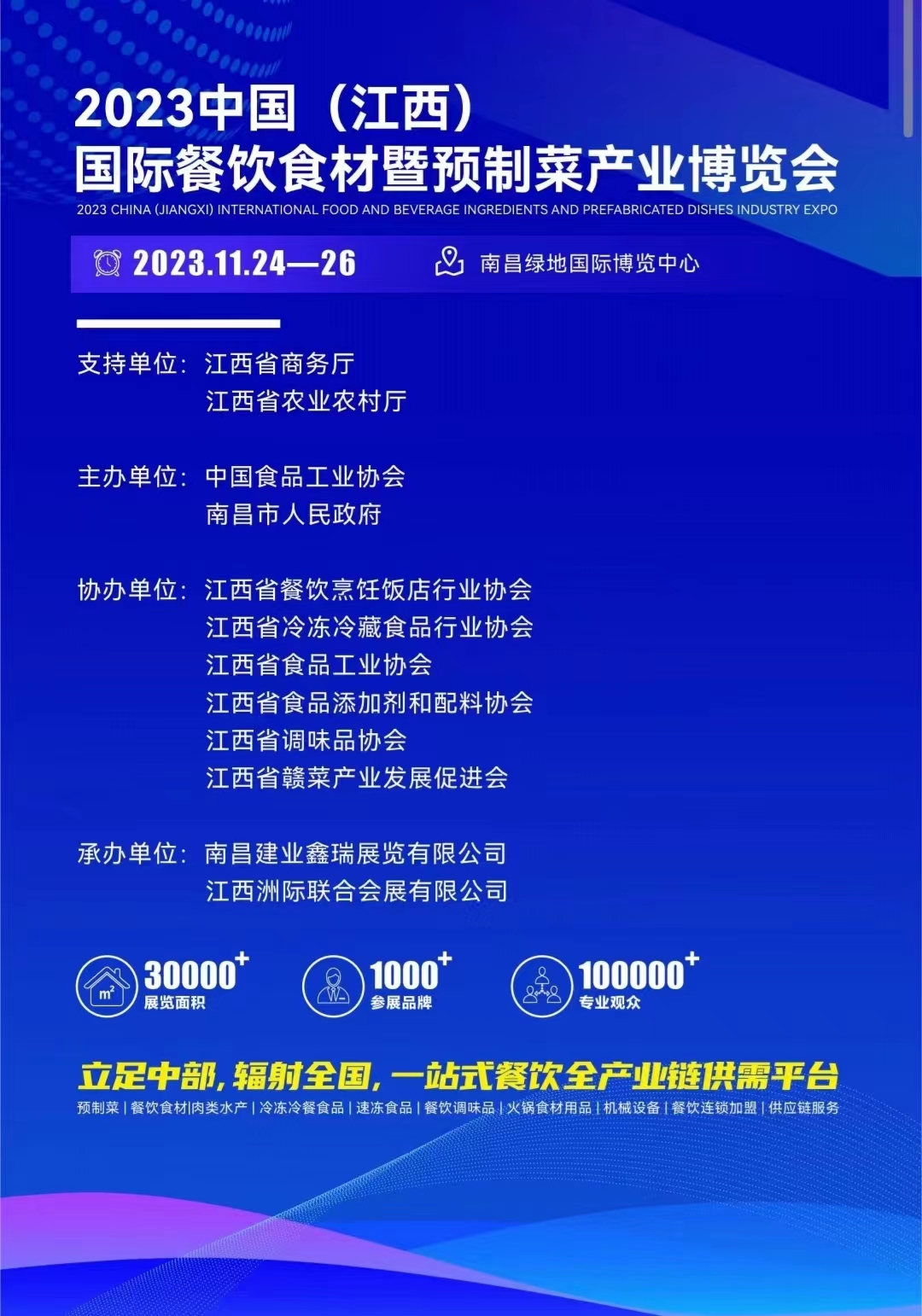 2023中国(江西)餐饮食材展暨预制菜产业博览会 展会时间:2023年11月24日-26日 展馆:中国 · 江西南昌绿地国际会展中心 地址:江西省南昌市红谷滩新区怀玉山大道1315号