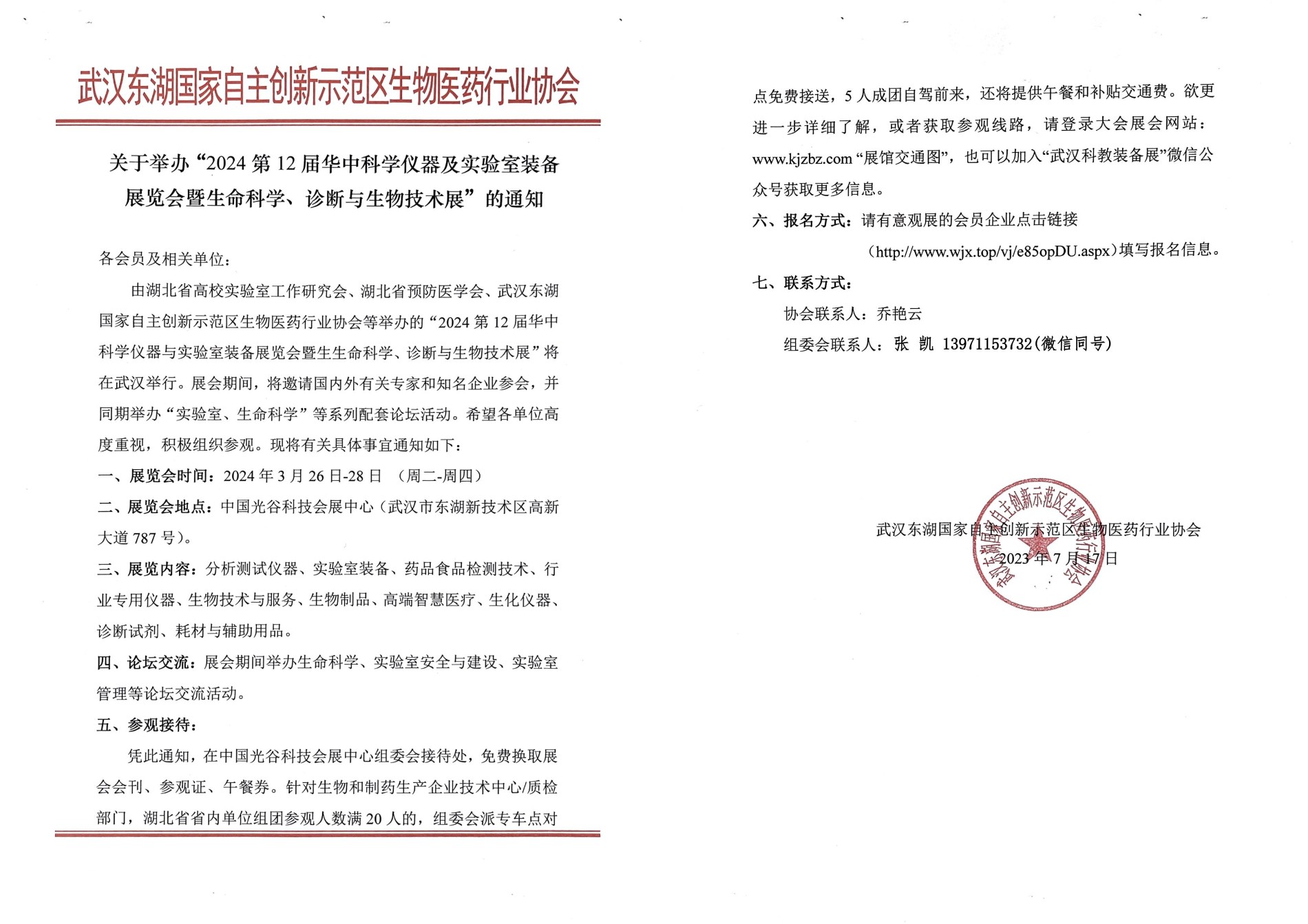 图文详情华中科仪展最新资讯:日前,武汉东湖国家自主创新示范区生物医药行业协会下达展会通知,将组团参与2024第12届华中武汉科学仪器及实验室装备展览会暨生命科学诊断与生物技术展会。(展位预定:张先生 139-7115-3732(微信同号)