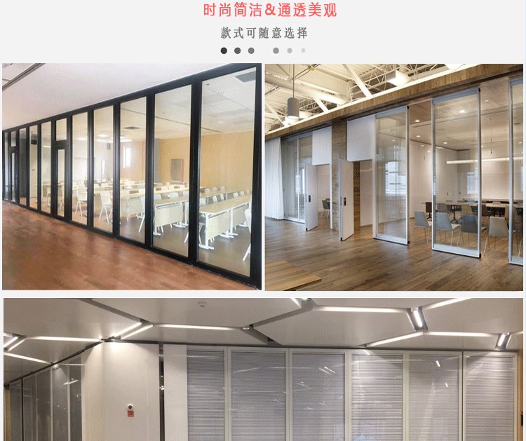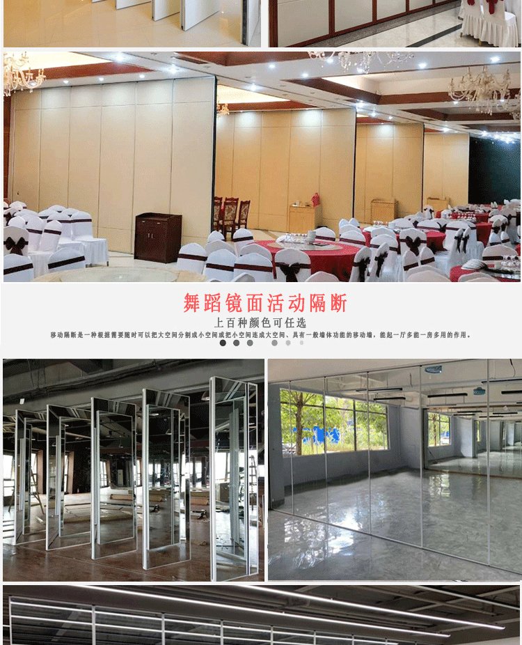 活动隔断具有高隔音、防火、可移动、操作简单等特点。极为适合星级酒店宴会厅、高档酒楼包间、高级写字楼会议室等场所进行空间间隔的使用。目前,活动隔断、固定隔断系列产品已经广泛适用在酒店、宾馆、多功能厅、会议室、宴会厅、写字楼、展厅、金融机构、政府办公楼、医院、工厂等多种场合。 活动隔断可以分为:拼装式活动隔断、推移式活动隔断、折叠式活动隔断、悬挂式活动隔断。活动隔断是一种根据需要随时把大空间分割成小空间或把小空间连成大空间、具有一般墙体功能的活动墙。活动隔断具有以下特点: 1.无地轨悬挂:地板无轨道,只需将轨道安装于天花板上; 2.稳定安全:隔断后稳固可靠,不易摆动; 3.隔音环保:隔音效果好,最大隔音系数可达53dB; 4.隔热节能:隔热性能优良,根据不同入座率,把大空间分割成小空间,以降低空调电耗; 5.高效防火:采用高效防火材料制作,防火性能良好; 6.美观大方:表面任意装饰,可与室内统一装饰效果; 7.收放灵活:隔板收放自如,推动灵活,一个人就可以完成隔断整个过程; 8.收藏方便:收板时,隔板可以隐藏在专用储柜中,不影响整体美观; 9.应用广泛:可应用于会议厅、展览厅、餐厅、高洁净工厂和办公室等场所