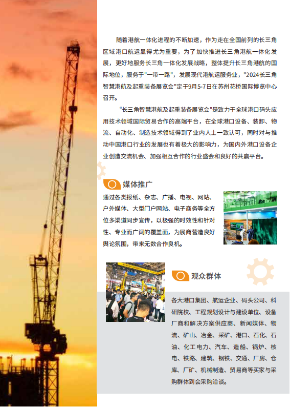 图文详情长三角智慧港航及起重装备展览会"是致力于全球港口码头应用技术领域国际贸易合作的高端平台,在全球港口设备、装卸、物流、自动化、制造技术领域得到了业内人士一致认可,同时对与推动中国港口行业的发展也有着**大的影响力,为国内外港口设备企业创造交流机会、加强相互合作的行业盛会和良好的共赢平台。