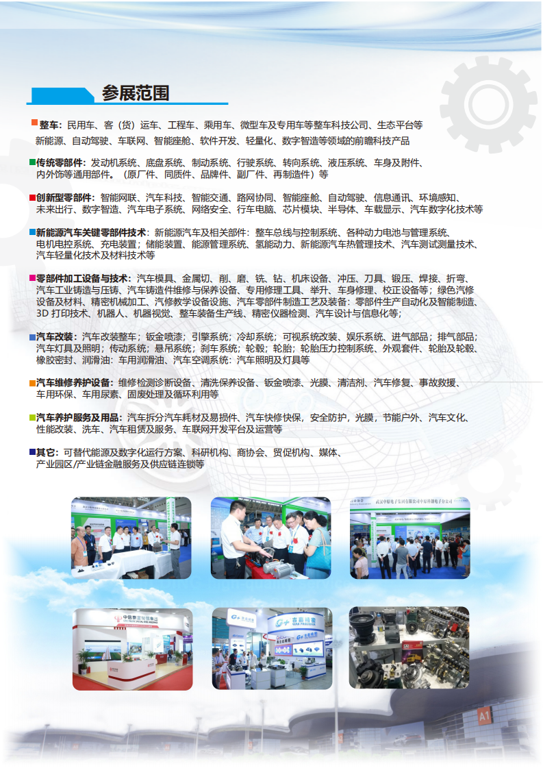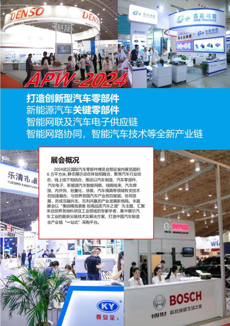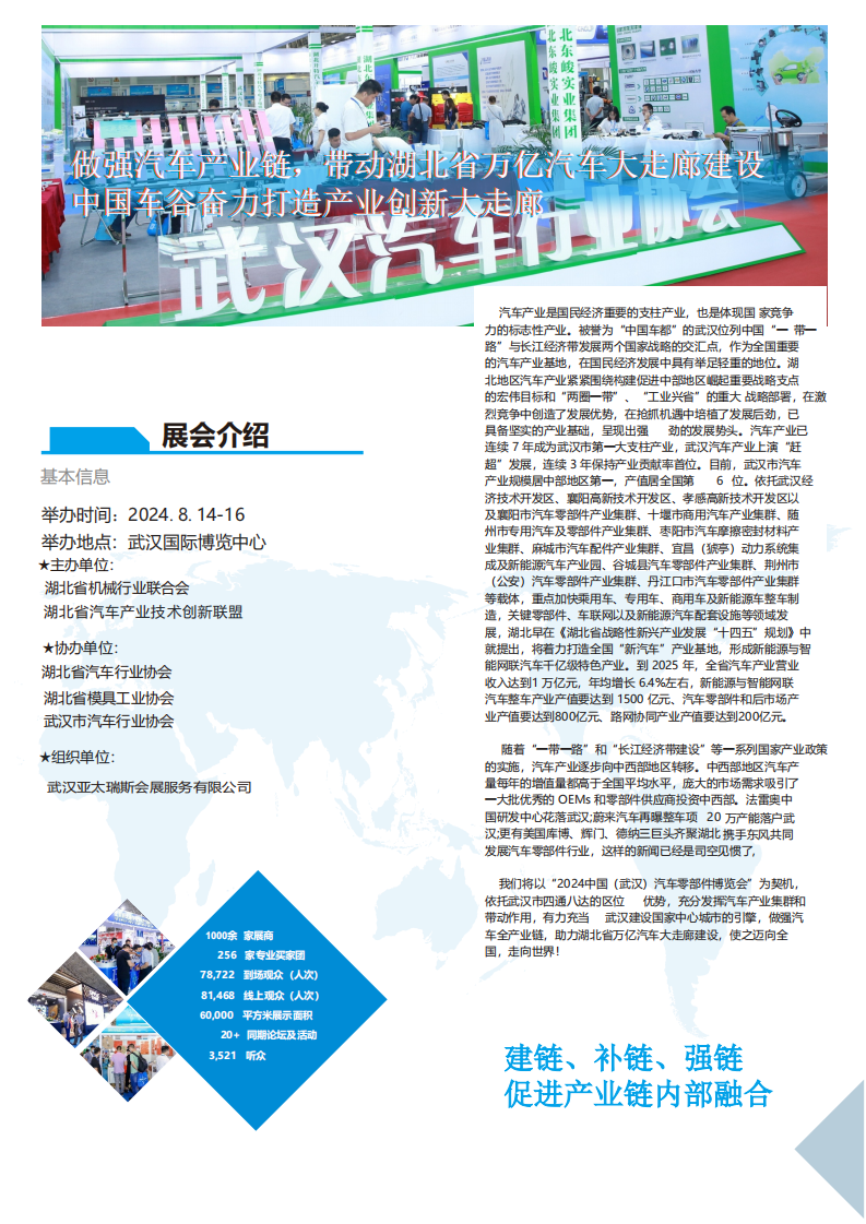 我们将以“2024中国(武汉)汽车零部件博览会”为契机,依托武汉市四通八达的区位 优势,充分发挥汽车产业集群和带动作用,有力充当 武汉建设国家中心城市的引擎,做强汽车全产业链,助力湖北省万亿汽车大走廊建设,使之迈向全国,走向世界!