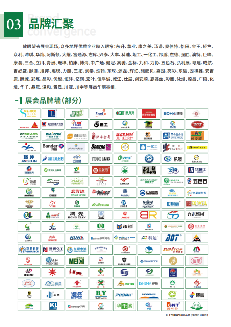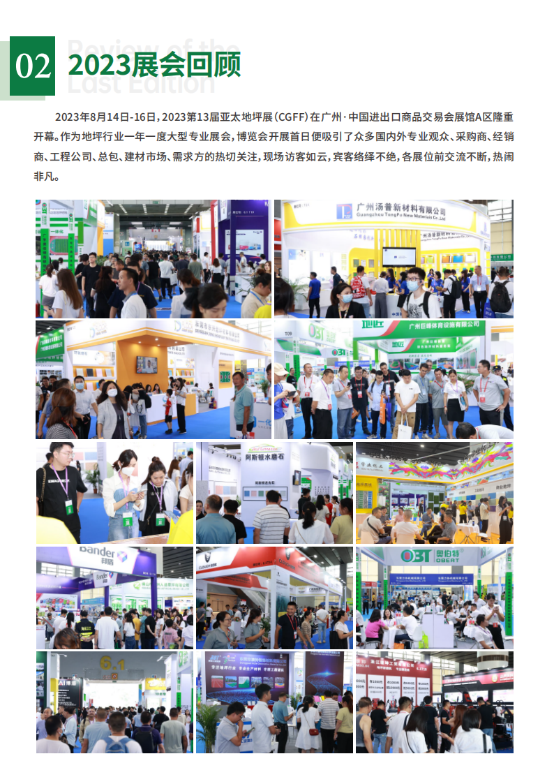 图文详情2024第14届亚太地坪展定于2024年5月10-12日在广州琶洲·保利世贸博览馆举办,50000㎡+展览面积、500+知名参展商、10000+新品/热品、60000多人次、10余场相关联活动。亚太地坪展(CGFF),经过十余载的沉淀,以及组展能力、协调性、号召力和自身13年的地坪行业影响力,早已被业界誉为“地坪圈的风向标”,亚太地坪展从产品展示、技术交流,到项目考察、工程集采,先后为超过1万余家客户提供对接服务,并与众多地产开发商、设计院、建筑企业、建材市场,建立了长期稳定的合作发展关系,展会汇聚地坪行业细分领域中的各个品牌,同时举行多个主题会议、现场实操,汇聚行业之声,共同开拓行业新思维,促进地坪行业创新发展,展会同期开启一系列赛事,以展为媒介,助力行业品牌宣传,助力企业获客,推动地坪行业经济发展。