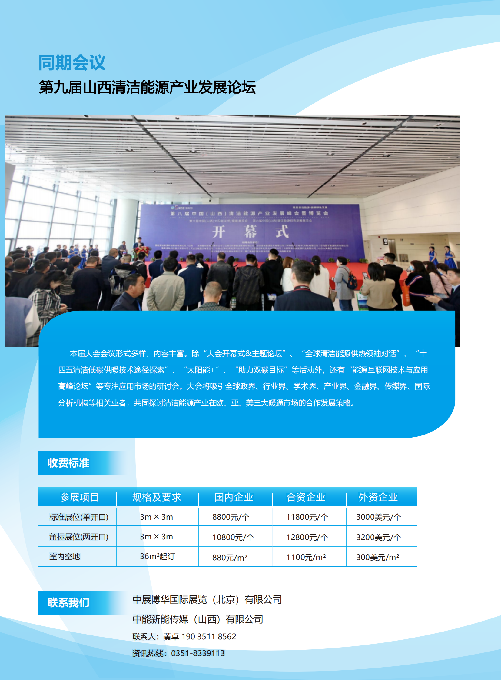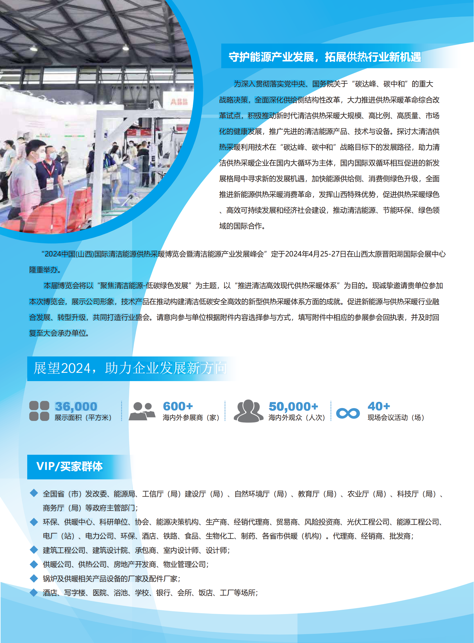 图文详情“2024中国(山西)国际清洁能源供热采暖博览会暨清洁能源产业发展峰会”定于2024年4月25-27日在山西太原晋阳湖国际会展中心隆重举办。本届博览会将以“聚焦清洁能源-低碳绿色发展”为主题,以“推进清洁高效现代供热采暖体系”为目的。现诚挚邀请贵单位参加本次博览会,展示公司形象,技术产品在推动构建清洁低碳安全高效的新型供热采暖体系方面的成就。促进新能源与供热采暖行业融合发展、转型升级,共同打造行业盛会。请意向参与单位根据附件内容选择参与方式,填写附件中相应的参展参会回执表,并及时回复至大会承办单位。