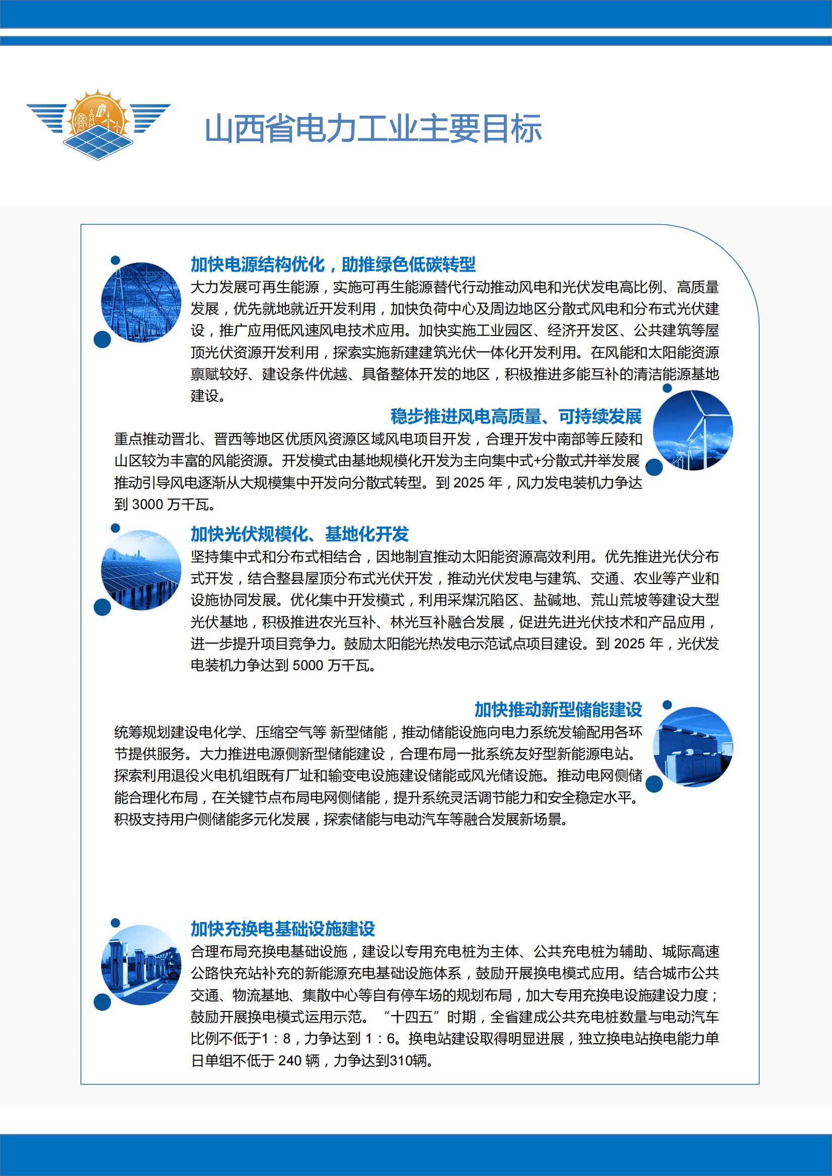 图文详情为全面贯彻习近平总书记能源安全新战略和视察山西重要讲话重要指示精神,山西作为全国唯一的全省域国家资源型经济转型发展综合配套改革试验区、能源革命综合改革试点,在全国能源电力发展格局中具有不可替代的重要战略地位。积极响应《山西省可再生能源发展“+四五”规划》(晋能源新能源发[2022)369号)、《山西省电力工业“十四五”发展规划》(晋能源规[2023]44号)、《“十四五”新型储能发展实施方案》(晋能源新能源发[2022]353号)、《山西省煤炭清高效利用促进条例》等文件精神。依托山西“全国综合能源基地”“国家资源型经济转型发展综合配套改革试验区”“能源革命综合改革试点”定位,锚定“四个革命、一个合作”能源安全新战略,推进“五大基地”建设和能源产业“五个一体化”融合发展,助力山西能源革命综合改革试点工作迈向高质量。