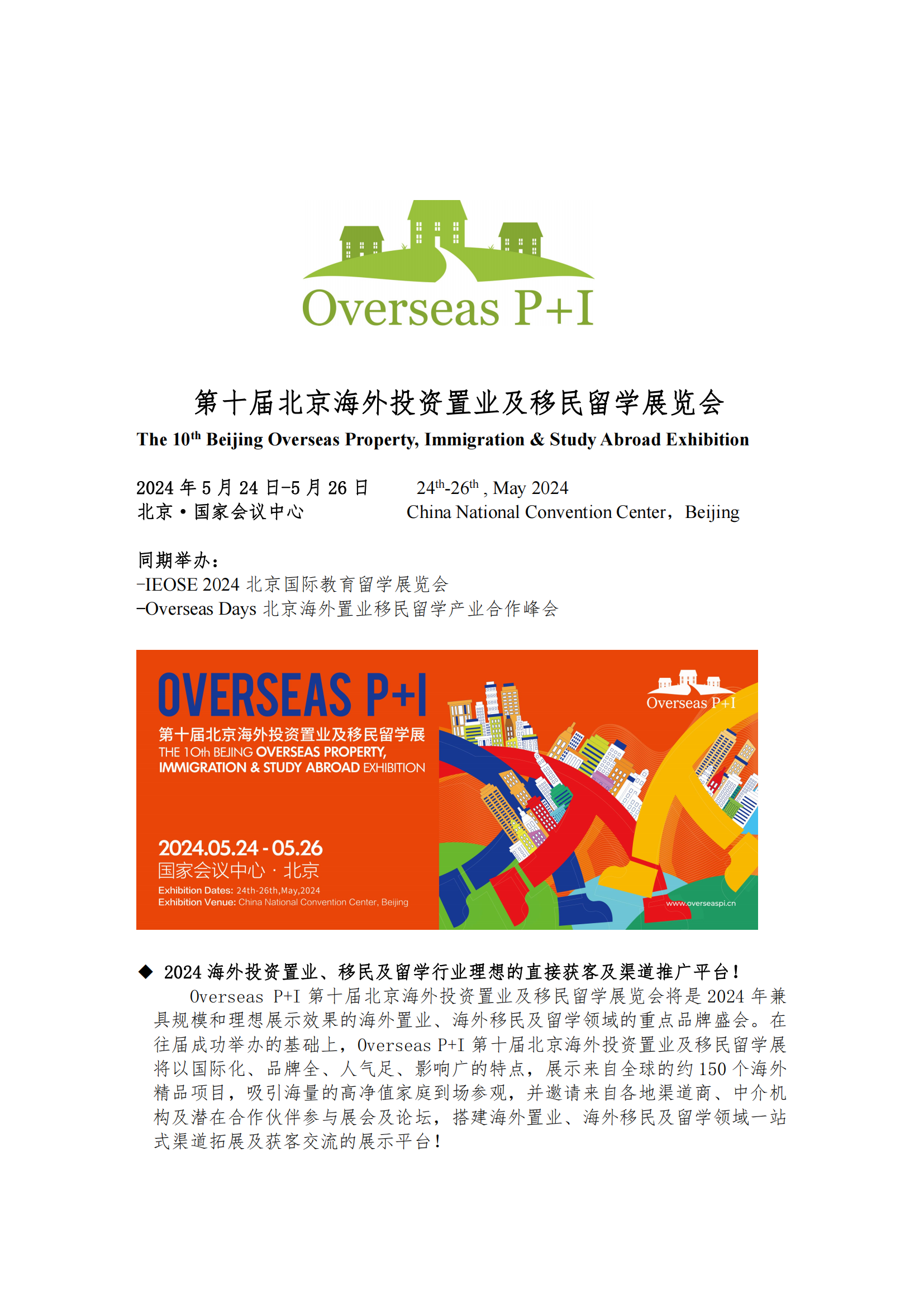同期举办: -IEOSE 2024 北京国际教育留学展览会 -Overseas Days 北京海外置业移民留学产业合作峰会 ◆ 2024 海外投资置业、移民及留学行业理想的直接获客及渠道推广平台! Overseas P+I
