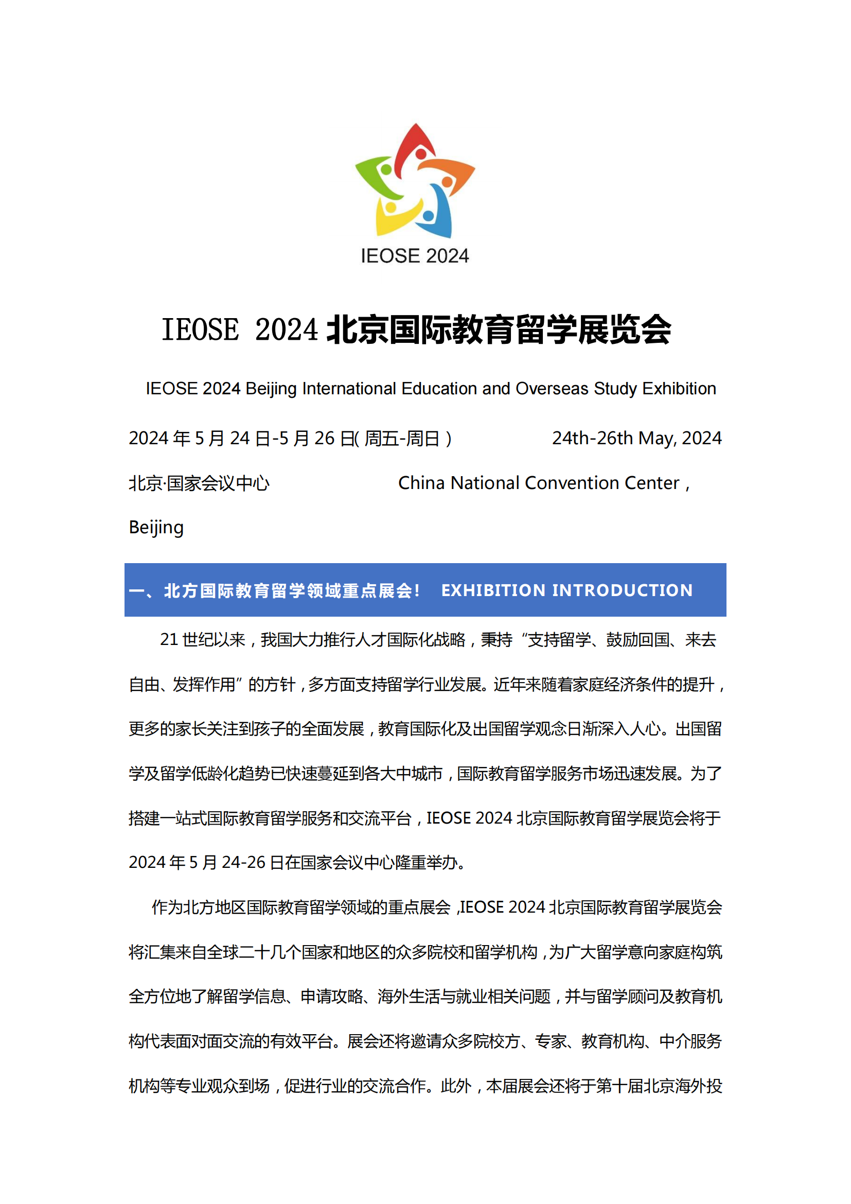 21 世纪以来,我国大力推行人才国际化战略,秉持“支持留学、鼓励回国、来去 自由、发挥作用”的方针,多方面支持留学行业发展。近年来随着家庭经济条件的提升, 更多的家长关注到孩子的全面发展,教育国际化及出国留学观念日渐深入人心。出国留 学及留学低龄化趋势已快速蔓延到各大中城市,国际教育留学服务市场迅速发展。为了 搭建一站式国际教育留学服务和交流平台,IEOSE 2024 北京国际教育留学展览会将于 2024 年 5 月 24-26 日在国家会议中心隆重举办。 作为北方地区国际教育留学领域的重点展会,IEOSE 2024 北京国际教育留学展览会 将汇集来自全球二十几个国家和地区的众多院校和留学机构,为广大留学意向家庭构筑 全方位地了解留学信息、申请攻略、海外生活与就业相关问题,并与留学顾问及教育机 构代表面对面交流的有效平台。展会还将邀请众多院校方、专家、教育机构、中介服务 机构等专业观众到场,促进行业的交流合作。此外,本届展会还将于第十届北京海外投资置业及移民展同期举办,共享丰富的观众资源,为各海外院校、出国留学机构及国际 教育机构搭建北方地区招生宣传、教育合作及品牌推广的理想平台。