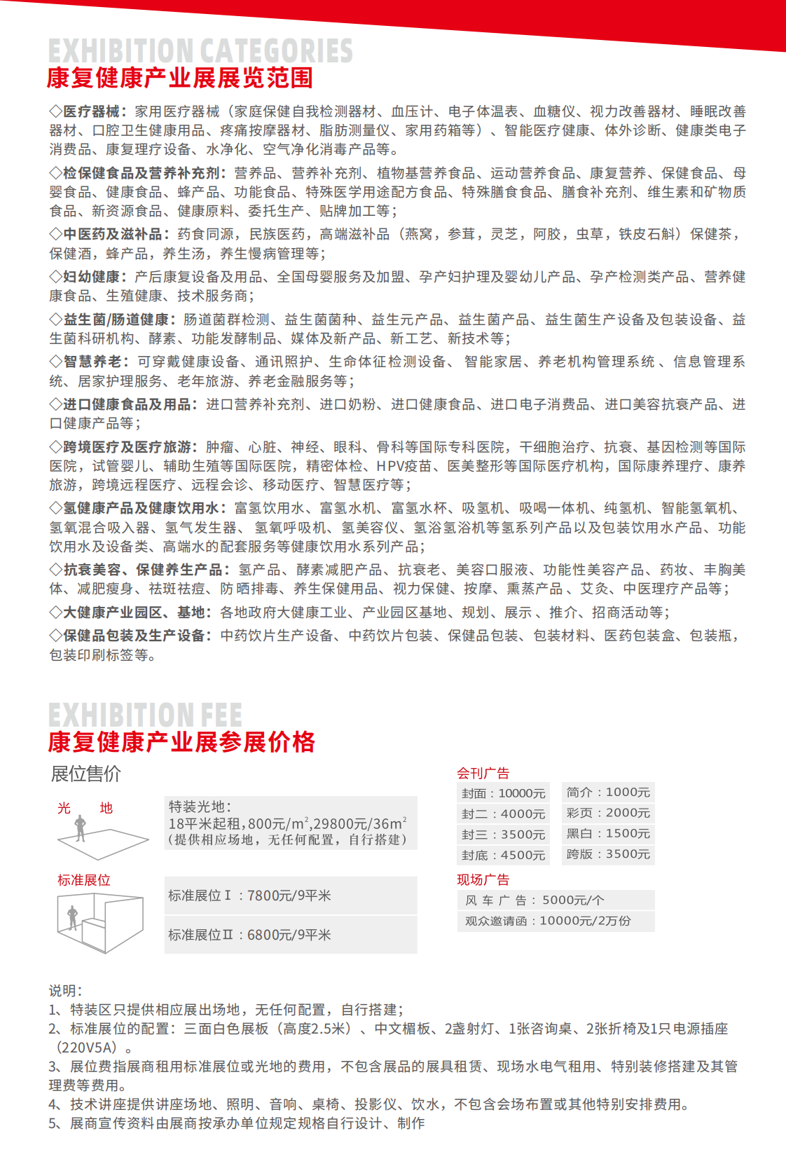 ◇医疗器械:家⽤医疗器械(家庭保健⾃我检测器材、⾎压计、电⼦体温表、⾎糖仪、视⼒改善器材、睡眠改善 器材、⼝腔卫⽣健康⽤品、疼痛按摩器材、脂肪测量仪、家⽤药箱等)、智能医疗健康、体外诊断、健康类电⼦ 消费品、康复理疗设备、⽔净化、空⽓净化消毒产品等。 ◇检保健⻝品及营养补充剂:营养品、营养补充剂、植物基营养⻝品、运动营养⻝品、康复营养、保健⻝品、⺟ 婴⻝品、健康⻝品、蜂产品、功能⻝品、特殊医学⽤途配⽅⻝品、特殊膳⻝⻝品、膳⻝补充剂、维⽣素和矿物质 ⻝品、新资源⻝品、健康原料、委托⽣产、贴牌加⼯等; ◇中医药及滋补品:药⻝同源,⺠族医药,⾼端滋补品(燕窝,参茸,灵芝,阿胶,⾍草,铁⽪⽯斛)保健茶, 保健酒,蜂产品,养⽣汤,养⽣慢病管理等; ◇妇幼健康:产后康复设备及⽤品、全国⺟婴服务及加盟、孕产妇护理及婴幼⼉产品、孕产检测类产品、营养健 康⻝品、⽣殖健康、技术服务商; ◇益⽣菌/肠道健康:肠道菌群检测、益⽣菌菌种、益⽣元产品、益⽣菌产品、益⽣菌⽣产设备及包装设备、益 ⽣菌科研机构、酵素、功能发酵制品、媒体及新产品、新⼯艺、新技术等; ◇智慧养⽼:可穿戴健康设备、通讯照护、⽣命体征检测设备、 智能家居、养⽼机构管理系统 、信息管理系 统、居家护理服务、⽼年旅游、养⽼⾦融服务等; ◇进⼝健康⻝品及⽤品:进⼝营养补充剂、进⼝奶粉、进⼝健康⻝品、进⼝电⼦消费品、进⼝美容抗衰产品、进 ⼝健康产品等; ◇跨境医疗及医疗旅游:肿瘤、⼼脏、神经、眼科、⻣科等国际专科医院,⼲细胞治疗、抗衰、基因检测等国际 医院,试管婴⼉、辅助⽣殖等国际医院,精密体检、HPV疫苗、医美整形等国际医疗机构,国际康养理疗、康养 旅游,跨境远程医疗、远程会诊、移动医疗、智慧医疗等; ◇氢健康产品及健康饮⽤⽔:富氢饮⽤⽔、富氢⽔机、富氢⽔杯、吸氢机、吸喝⼀体机、纯氢机、智能氢氧机、 氢氧混合吸⼊器、氢⽓发⽣器、 氢氧呼吸机、氢美容仪、氢浴氢浴机等氢系列产品以及包装饮⽤⽔产品、功能 饮⽤⽔及设备类、⾼端⽔的配套服务等健康饮⽤⽔系列产品; ◇抗衰美容、保健养⽣产品:氢产品、酵素减肥产品、抗衰⽼、美容⼝服液、功能性美容产品、药妆、丰胸美 体、减肥瘦⾝、祛斑祛痘、防晒排毒、养⽣保健⽤品、视⼒保健、按摩、熏蒸产品、艾灸、中医理疗产品等; ◇⼤健康产业园区、基地:各地政府⼤健康⼯业、产业园区基地、规划、展⽰、推介、招商活动等; ◇保健品包装及⽣产设备:中药饮⽚⽣产设备、中药饮⽚包装、保健品包装、包装材料、医药包装盒、包装瓶, 包装印刷标签等。
