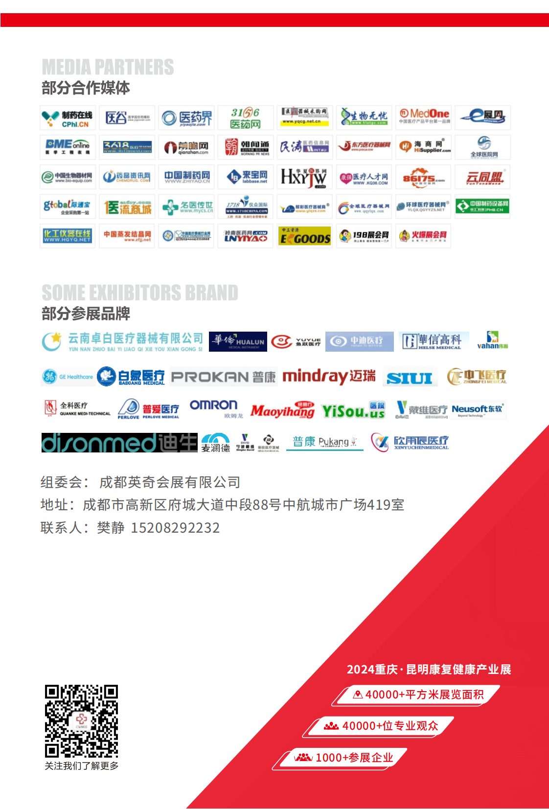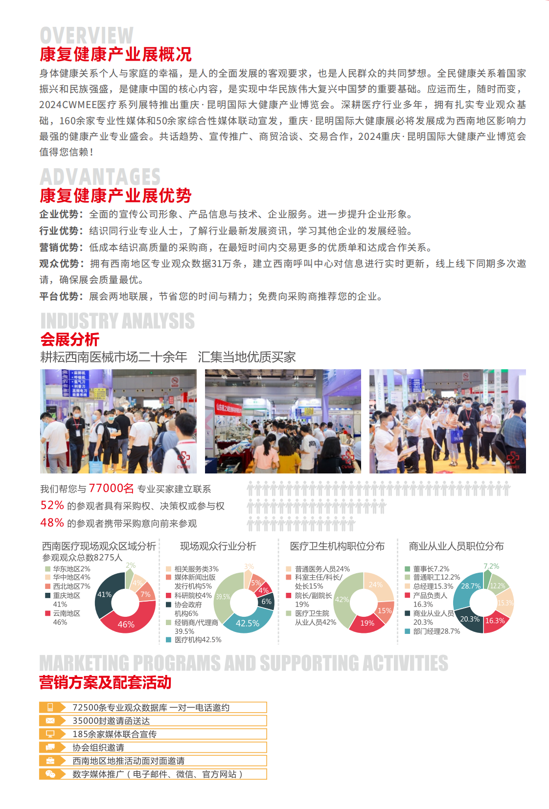 图文详情⾝体健康关系个⼈与家庭的幸福,是⼈的全⾯发展的客观要求,也是⼈⺠群众的共同梦想。全⺠健康关系着国家 振兴和⺠族强盛,是健康中国的核⼼内容,是实现中华⺠族伟⼤复兴中国梦的重要基础。应运⽽⽣,随时⽽变, 2024CWMEE医疗系列展特推出重庆·昆明国际⼤健康产业博览会。深耕医疗⾏业多年,拥有扎实专业观众基 础,160余家专业性媒体和50余家综合性媒体联动宣发,重庆·昆明国际⼤健康展必将发展成为西南地区影响⼒ 最强的健康产业专业盛会。共话趋势、宣传推⼴、商贸洽谈、交易合作,2024重庆·昆明国际⼤健康产业博览会 值得您信赖! 企业优势:全⾯的宣传公司形象、产品信息与技术、企业服务。进⼀步提升企业形象。 ⾏业优势:结识同⾏业专业⼈⼠,了解⾏业最新发展资讯,学习其他企业的发展经验。 营销优势:低成本结识⾼质量的采购商,在最短时间内交易更多的优质单和达成合作关系。 观众优势:拥有西南地区专业观众数据31万条,建⽴西南呼叫中⼼对信息进⾏实时更新,线上线下同期多次邀 请,确保展会质量最优。 平台优势:展会两地联展,节省您的时间与精⼒;免费向采购商推荐您的企业。