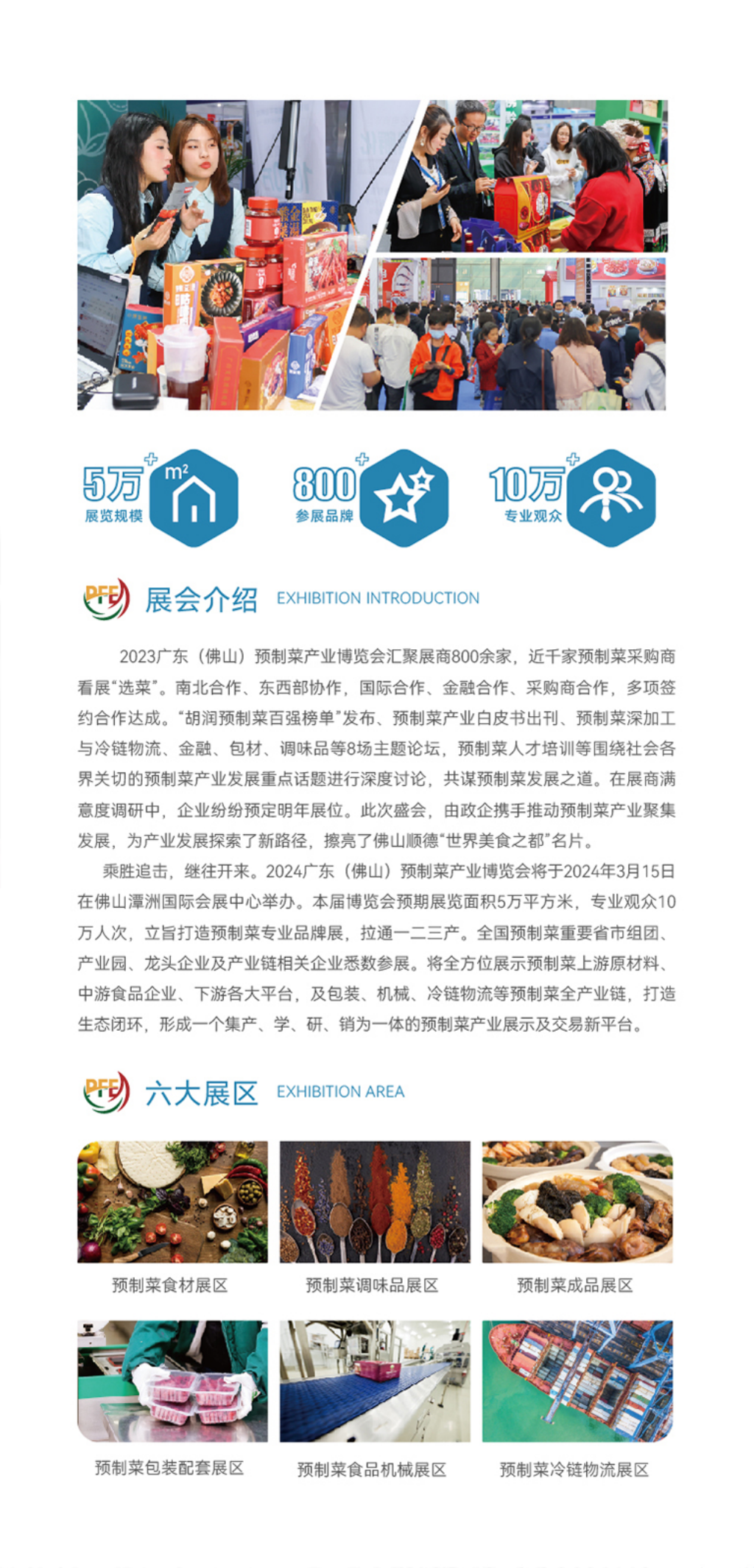 图文详情2023广东(佛山)预制菜产业博览会汇聚展商800余家,近千家预制菜采购商看展“选菜”。南北合作、东西部协作,国际合作、金融合作、采购商合作,多项签约合作达成。“胡润预制菜百强榜单”发布、预制菜产业白皮书出刊、预制菜深加工与冷链物流、金融、包材、调味品等8场主题论坛,预制菜人才培训等围绕社会各界关切的预制菜产业发展重点话题进行深度讨论,共谋预制菜发展之道。在展商满意度调研中,企业纷纷预定明年展位。此次盛会,由政企携手推动预制菜产业聚集发展,为产业发展探索了新路径,擦亮了佛山顺德“世界美食之都”名片。乘胜追击,继往开来。2024广东(佛山)预制菜产业博览会将于2024年3月15日在佛山潭洲国际会展中心举办。本届博览会预期展览面积5万平方米,专业观众10万人次,立旨打造预制菜专业品牌展,拉通一二三产。全国预制菜重要省市组团、产业园、龙头企业及产业链相关企业悉数参展。将全方位展示预制菜上游原材料、中游食品企业、下游各大平台,及包装、机械、冷链物流等预制菜全产业链,打造生态闭环,形成一个集产、学、研、销为一体的预制菜产业展示及交易新平台。