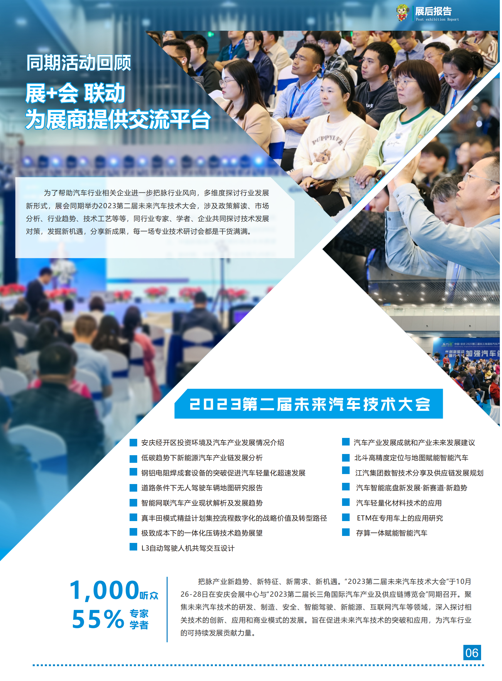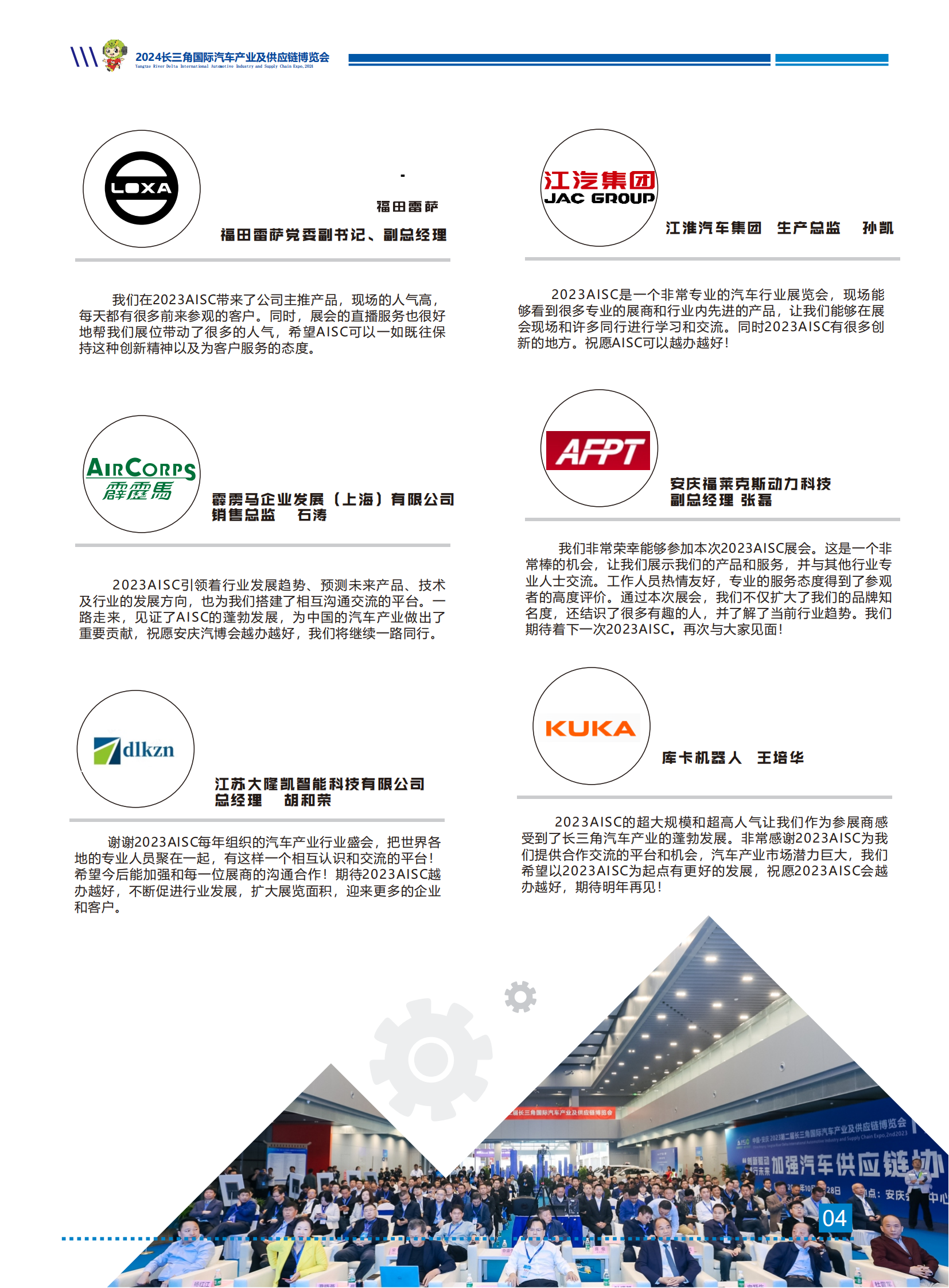 图文详情当前,全球新一轮科技和产业变革蓬勃发展,汽车与能源、交通、信息通信等领域有关技术加速融合,电 动化、网联化、智能化成为汽车产业的发展潮流和趋势。长三角一体化发展中,新能源汽车作为优势产业将迎 来发展新机遇,安徽省高度重视汽车产业发展,大力实施制造强省发展战略,把发展壮大汽车产业作为推动制 造业发展的重要抓手,提出将汽车及零部件产业打造成为万亿级产业的目标。在拥有振宜、江淮、福田雷萨三 大整车企业以及二百余家汽车产业链优势下,安庆充分发挥龙头企业“链主”带动作用,以局部带动整体,正逐 步推动汽车产业全环节全链条数字化转型。 长三角汽车产业及供应链博览会已经成功在安庆举办两届。依托安徽乃至长三角地区良好的产业优势,为 期三天的2023第二届长三角汽车产业博览会展出面积达25000㎡,350+知名企业参展,举办了20+场论坛活 动以及新供应链对接会,签约意向采购合同1.5亿元人民币。为业内人士提供了产品展示、技术交流、行业推广 及商贸对接的全方位机遇,已逐步成为我国长三角地区规模大、影响力强的高品质、综合性、专业化的品牌博 览会。 依托长三角庞大的市场需求和上海得天独厚的经济地位,2024年第三届长三角国际汽车产业及供应链博 览会继续肩负使命,将于2024年10月28-30日在安庆会展中心举办,以“创新驱动,智行未来”为主题,聚焦汽 车工程与装配技术、零部件机加工、制造装备、新能源汽车供应链等主题,汇聚国内外优秀企业和业界精英, 分享世界领先的前沿技术、创新应用和解决方案,推动参展参观企业跨越价值链上下游开展商务洽谈和合作对 接,扩大和加速新技术商业应用,全力拓展新商机,助力汽车产业发展提质增速。