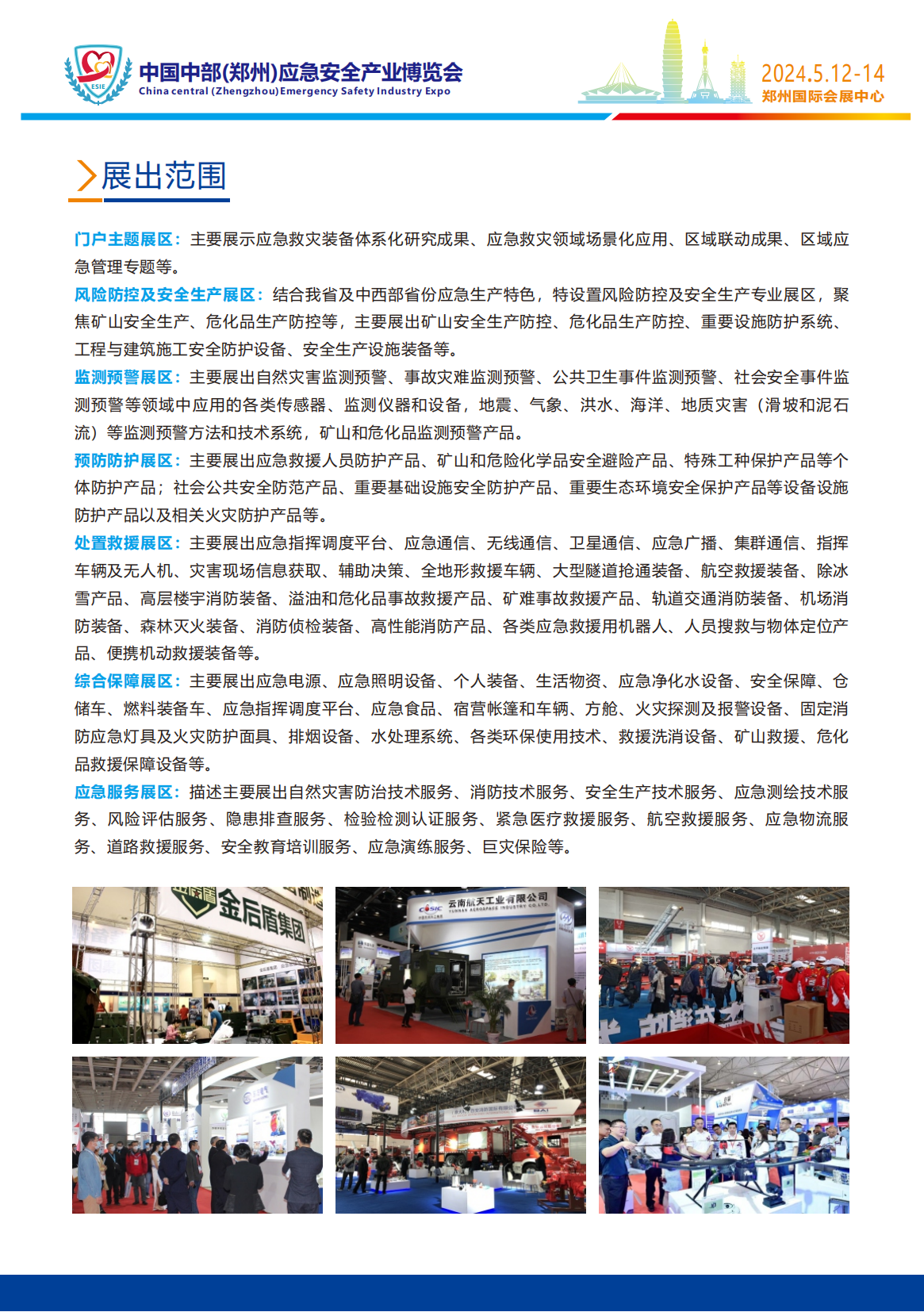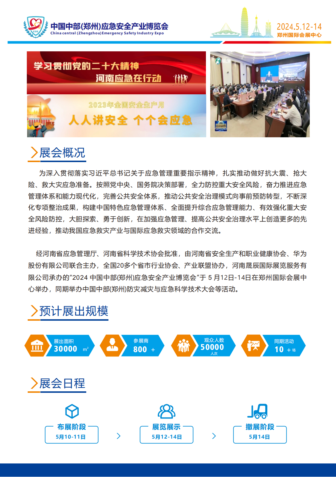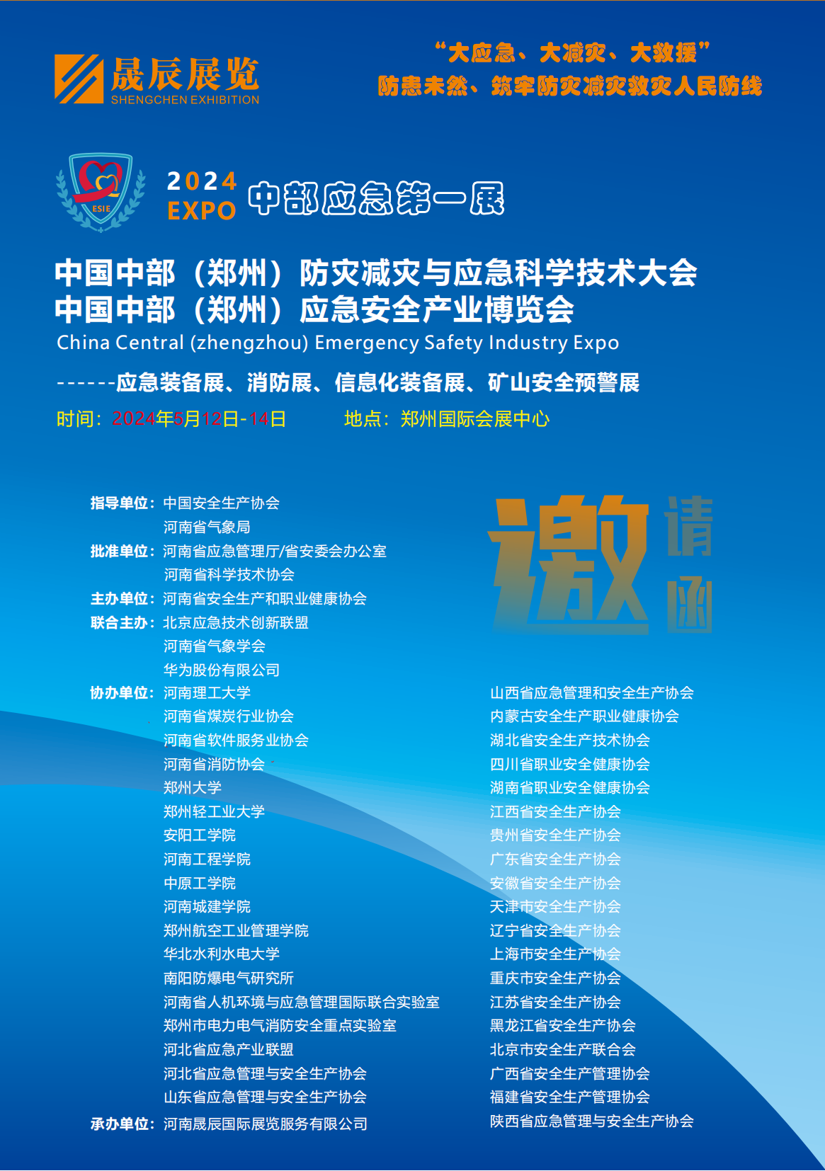 图文详情为深入贯彻落实习近平总书记关于应急管理重要指示精神,扎实推动做好抗大震、抢大 险、救大灾应急准备。按照党中央、国务院决策部署,全力防控重大安全风险,奋力推进应急 管理体系和能力现代化,完善公共安全体系,推动公共安全治理模式向事前预防转型,不断深 化专项整治成果,构建中国特色应急管理体系、全面提升综合应急管理能力、有效强化重大安 全风险防控,大胆探索、勇于创新,在加强应急管理、提高公共安全治理水平上创造更多的先 进经验,推动我国应急救灾产业与国际应急救灾领域的合作交流。 经河南省应急管理厅、河南省科学技术协会批准,由河南省安全生产和职业健康协会、华为 股份有限公司联合主办,全国20多个省市行业协会、产业联盟协办,河南晟辰国际展览服务有 限公司承办的“2024 中国中部(郑州)应急安全产业博览会”于 5 月12日-14日在郑州国际会展中 心举办,同期举办中国中部(郑州)防灾减灾与应急科学技术大会等活动。