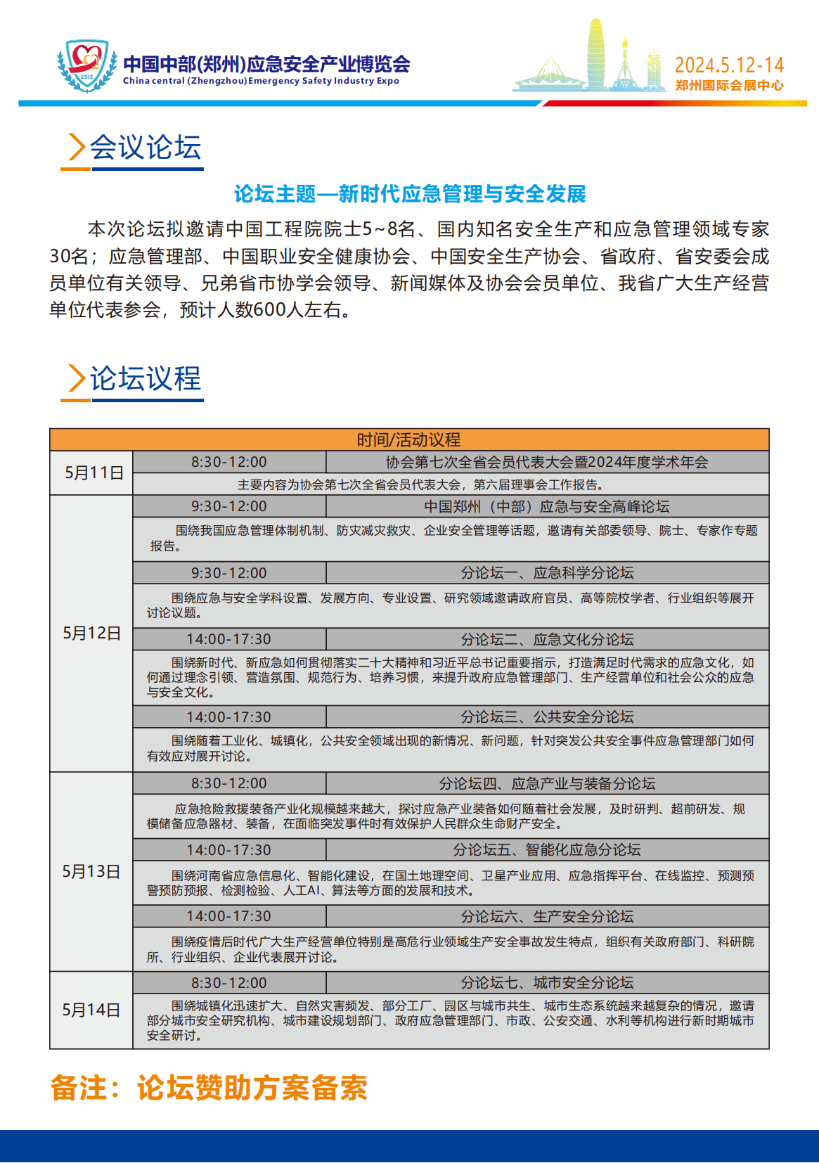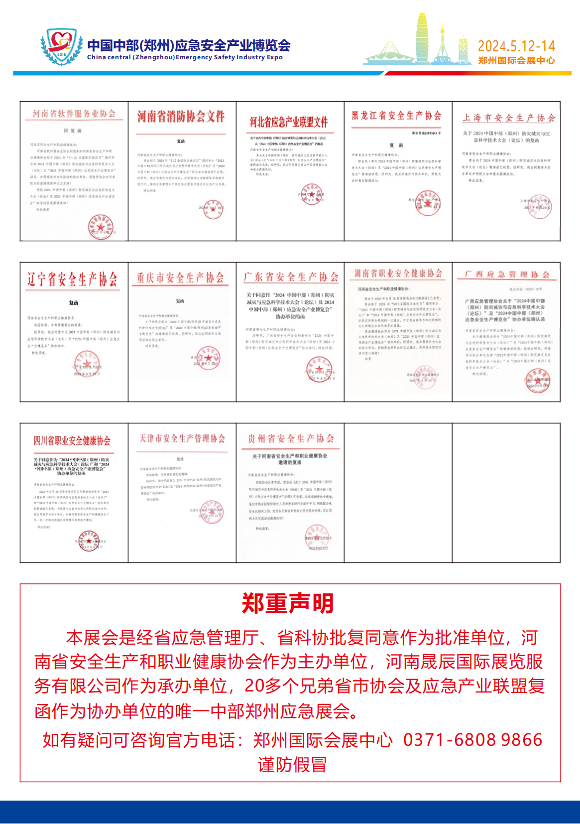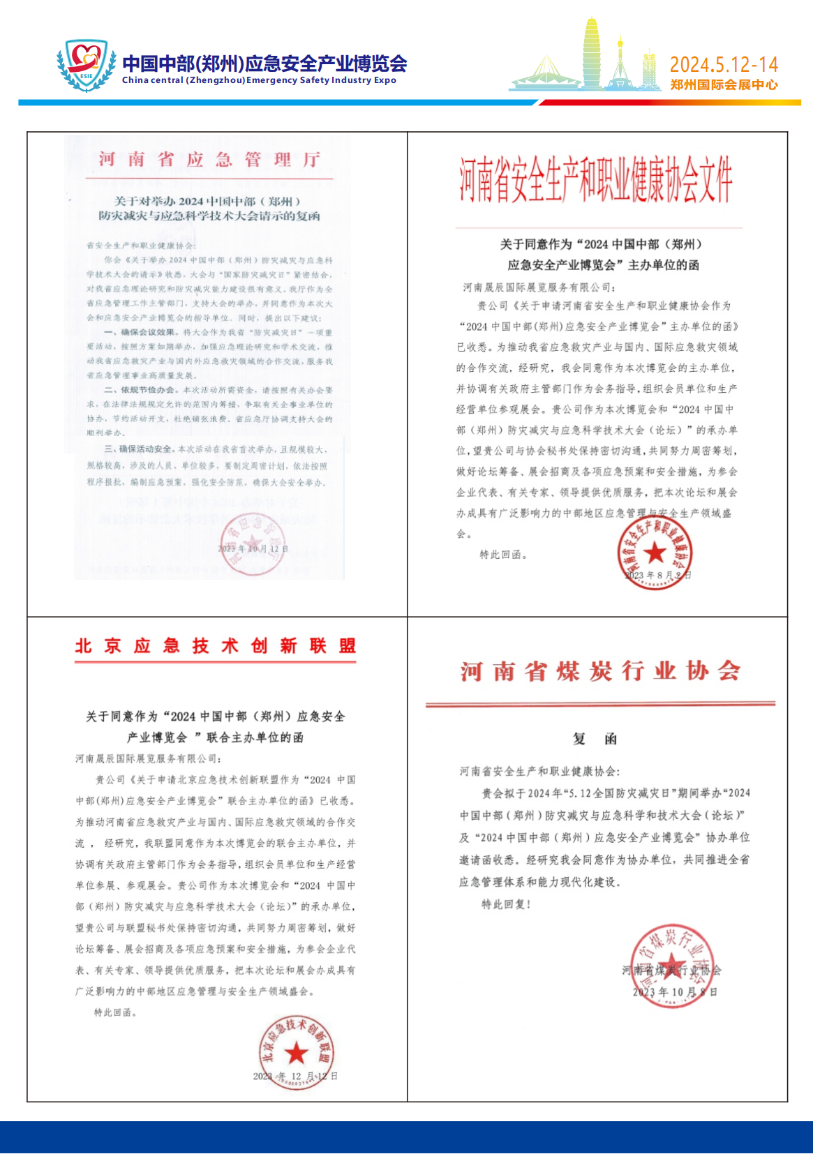 图文详情为深入贯彻落实习近平总书记关于应急管理重要指示精神,扎实推动做好抗大震、抢大 险、救大灾应急准备。按照党中央、国务院决策部署,全力防控重大安全风险,奋力推进应急 管理体系和能力现代化,完善公共安全体系,推动公共安全治理模式向事前预防转型,不断深 化专项整治成果,构建中国特色应急管理体系、全面提升综合应急管理能力、有效强化重大安 全风险防控,大胆探索、勇于创新,在加强应急管理、提高公共安全治理水平上创造更多的先 进经验,推动我国应急救灾产业与国际应急救灾领域的合作交流。 经河南省应急管理厅、河南省科学技术协会批准,由河南省安全生产和职业健康协会、华为 股份有限公司联合主办,全国20多个省市行业协会、产业联盟协办,河南晟辰国际展览服务有 限公司承办的“2024 中国中部(郑州)应急安全产业博览会”于 5 月12日-14日在郑州国际会展中 心举办,同期举办中国中部(郑州)防灾减灾与应急科学技术大会等活动。