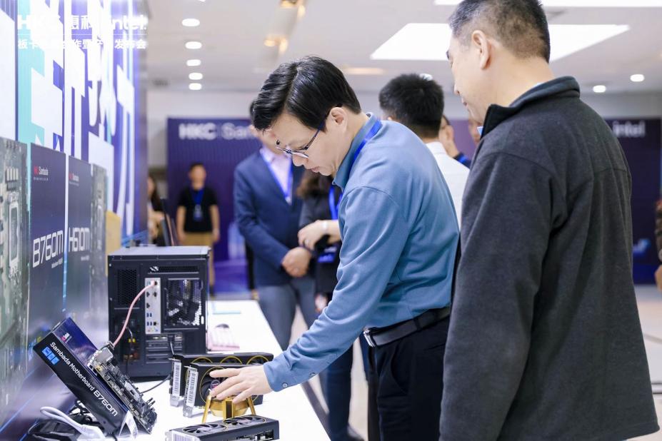 在发布会上,除了双方高管的精彩演讲,还设置了产品展示区,展示了采用英特尔方案的各类产品,包括显卡、主板、整机等。参会嘉宾和媒体代表都对这些产品给予了高度关注,纷纷体验和询问相关技术细节。