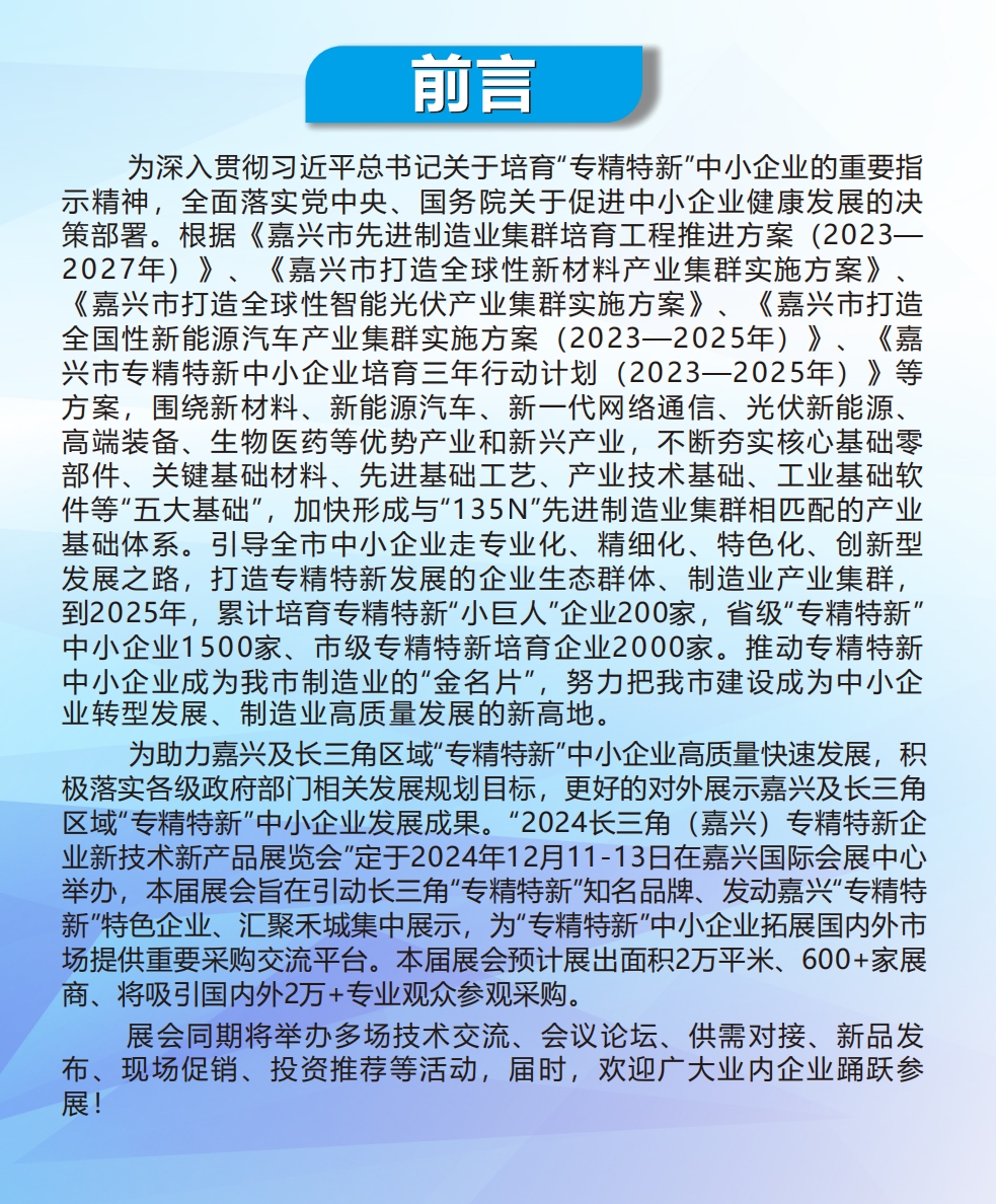 图文详情为助推嘉兴及长三角区域“专精特新”中小企业迈向高质量快速发展的新征程,我们积极响应各级政府部门的发展规划目标,以更加饱满的热情和务实的举措,向世界展示嘉兴及长三角地区“专精特新”中小企业的辉煌成果。为此,备受瞩目的“2024长三角(嘉兴)专精特新企业新技术新产品展览会”定于2024年12月11日至13日在嘉兴国际会展中心隆重举办。